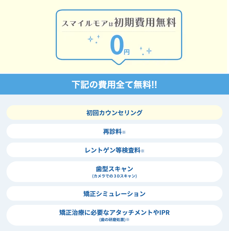 みなさん歯科医院の選び方は迷われますが、最終的には実績や症例数を参考にされる方が多いです! ※1 別途、初回検診料、再診料、リテーナー費用がかかります。 ※2 キレイラインの場合、月額プランがあるわけではないため、分割料金の例となります。デンタルローンを利用して10回コース(税込330,000円)を頭金なし・78回払いで支払う場合の分割支払金額です。一部クリニックはローン非対応。信販会社や手数料はクリニックにより異なります。 ※3 治療期間には個人差があります。保定期間は含みません。 \ コスパ✗実績で選ぶならここ! / スマイルモア矯正は最短3ヶ月、月額3,000円~※で治療が可能という、業界でも圧倒的にコスパがいい歯科医院です。 なんと症例数は170,000件以上※で、全国トップクラスの実績を持っています! スマイルモアの症例 様々な歯の状態に対応してきた実績があるから、一人ひとりに合わせたピッタリの治療をしてくれます! 各院で歯科医師や歯科衛生士に、どんなお悩みでも直接相談することができます◎ 提携医院が多く、通院頻度も3ヶ月に1度で良いため、忙しい方でも治療しやすいです◎ \ 最寄りの歯科医院をチェック! / 矯正実績のある高品質なマウスピースのみを使用しているので、短期間で安全に効果的な矯正治療ができるのが魅力です♪ 万が一、シミュレーション通りに歯が動かなかった場合も、マウスピースを作り直してもらえるので安心です◎ 今なら初回カウンセリングが完全無料のキャンペーン中! \ コスパ✗実績で選ぶならここ! / ※保険適用外の自由診療となります。※1 2017年6⽉〜2022年11⽉の契約者様の合計数 ※2 デンタルローンを利用して7回コース(税込319,000円)を頭金なし・96回払いで支払う場合の手数料抜き・税別の分割支払金額です。一部クリニックはローン非対応。信販会社や手数料はクリニックにより異なります。 ※1 キレイラインの場合、月額プランがあるわけではないため、分割料金の例となります。デンタルローンを利用して10回コース(税込330,000円)を頭金なし・78回払いで支払う場合の分割支払金額です。一部クリニックはローン非対応。信販会社や手数料はクリニックにより異なります。 ※2 治療期間には個人差があります。保定期間は含みません。 ※3 アタッチメント(追加治療)との併用はできません。ホワイトニング剤の使用タイミングは歯科医師までご相談ください。 ※1 別途、初回検診料、再診料、リテーナー費用がかかります。 ※2 キレイラインの場合、月額プランがあるわけではないため、分割料金の例となります。デンタルローンを利用して10回コース(税込330,000円)を頭金なし・78回払いで支払う場合の分割支払金額です。一部クリニックはローン非対応。信販会社や手数料はクリニックにより異なります。 ※3 治療期間には個人差があります。保定期間は含みません。マウスピース矯正のメリット